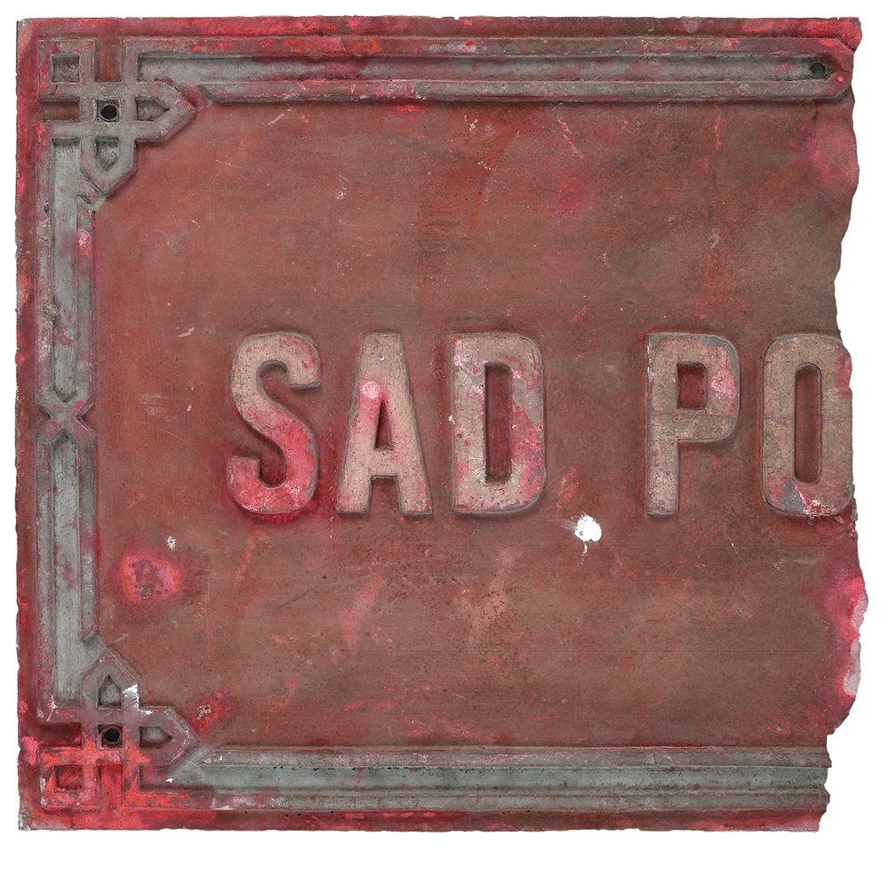 Torzo litinové tabulky pravděpodobně Poříčského sadu (nápis ve tvaru Sad Poříčský), později sadů Jana Švermy. Tento typ tabulek byl používán na přelomu 19. a 20. století. / Zdroj: Muzeum hlavního města Prahy, sign. H 339 984.Uliční tabulky